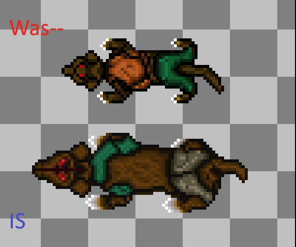 We were playing old school resident evil games and realize that our rooms were too much alike to one another. so we decided it was time to add some personalization. For an example, we are showcasing two different design we did for one of our rooms. It is funny how so little detail in the pixel world will change so much to an environment. The one on the left really feels like a warm and inviting room. And the one on the right really suggest a more cold approach to the same room. So to stay in the horror vibe we decided to keep the right one for this room.