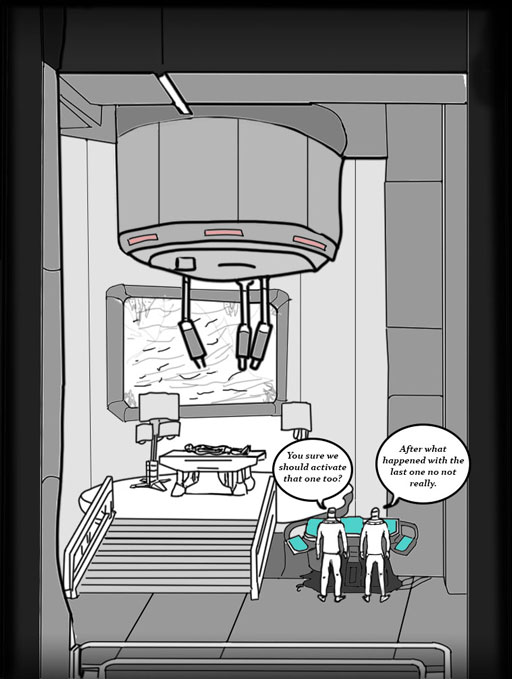 Secondly, on the left is the image from our little scene Dev comic (that you can catch on our Facebook page) to put the game in perspective before starting out. We really wanted this particular shot to represent the atmosphere in the world of SC. So here is a first glance at the scene from the comic in real time (in game graphics).